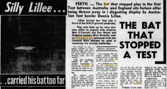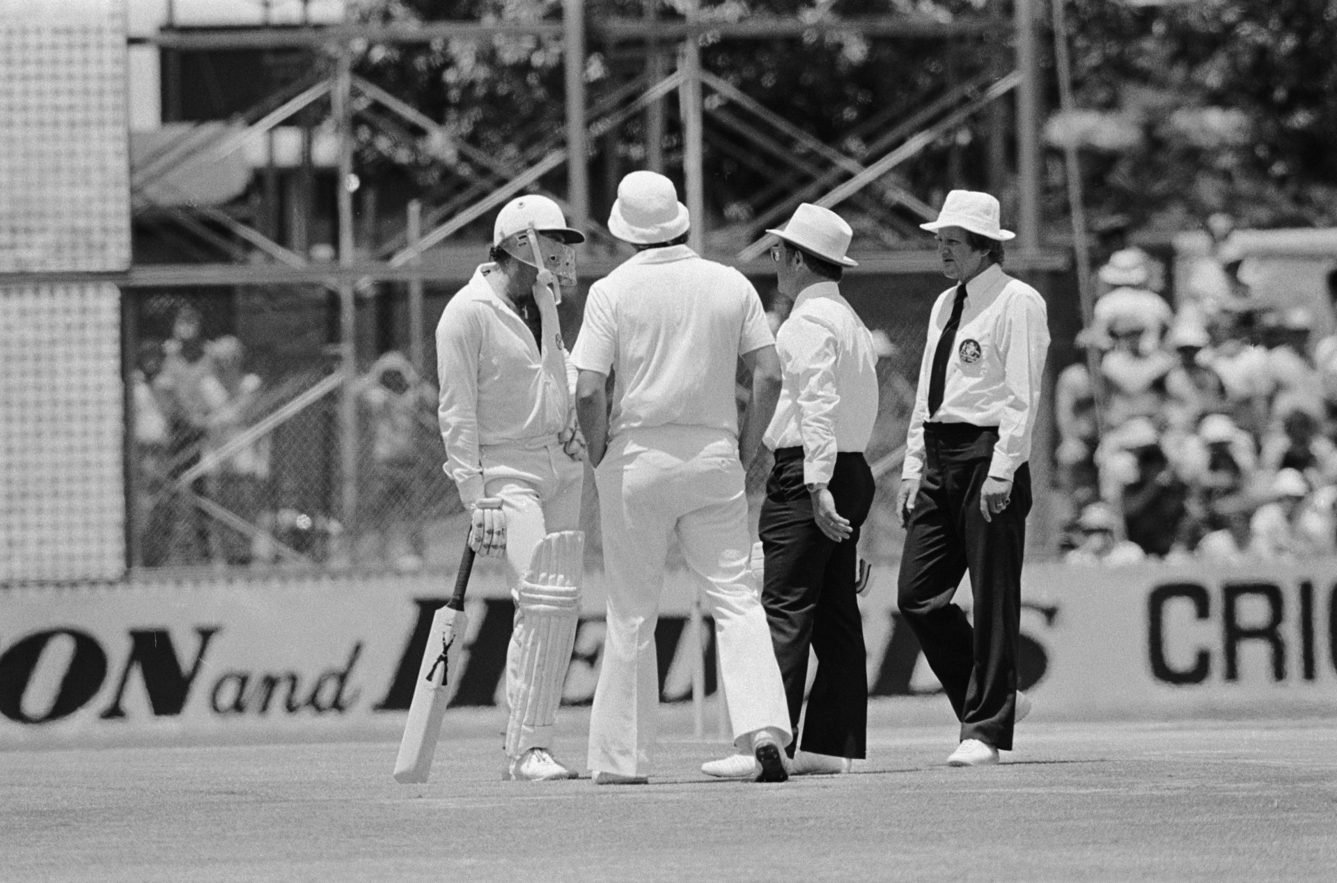 Lillee talks to the umpires about his aluminium bat. Adrian Murrell/Getty Images.