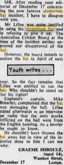 LILLEE'S ALUMINIUM BAT GETS MIXED REVIEWS