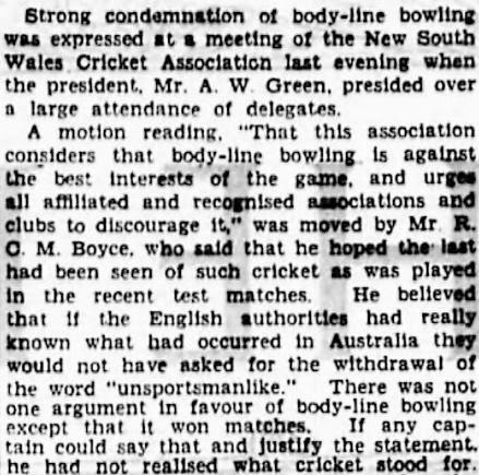 'Bitter Comments on Body-line Bowling.' Sydney Morning Herald, 11 April 1933.