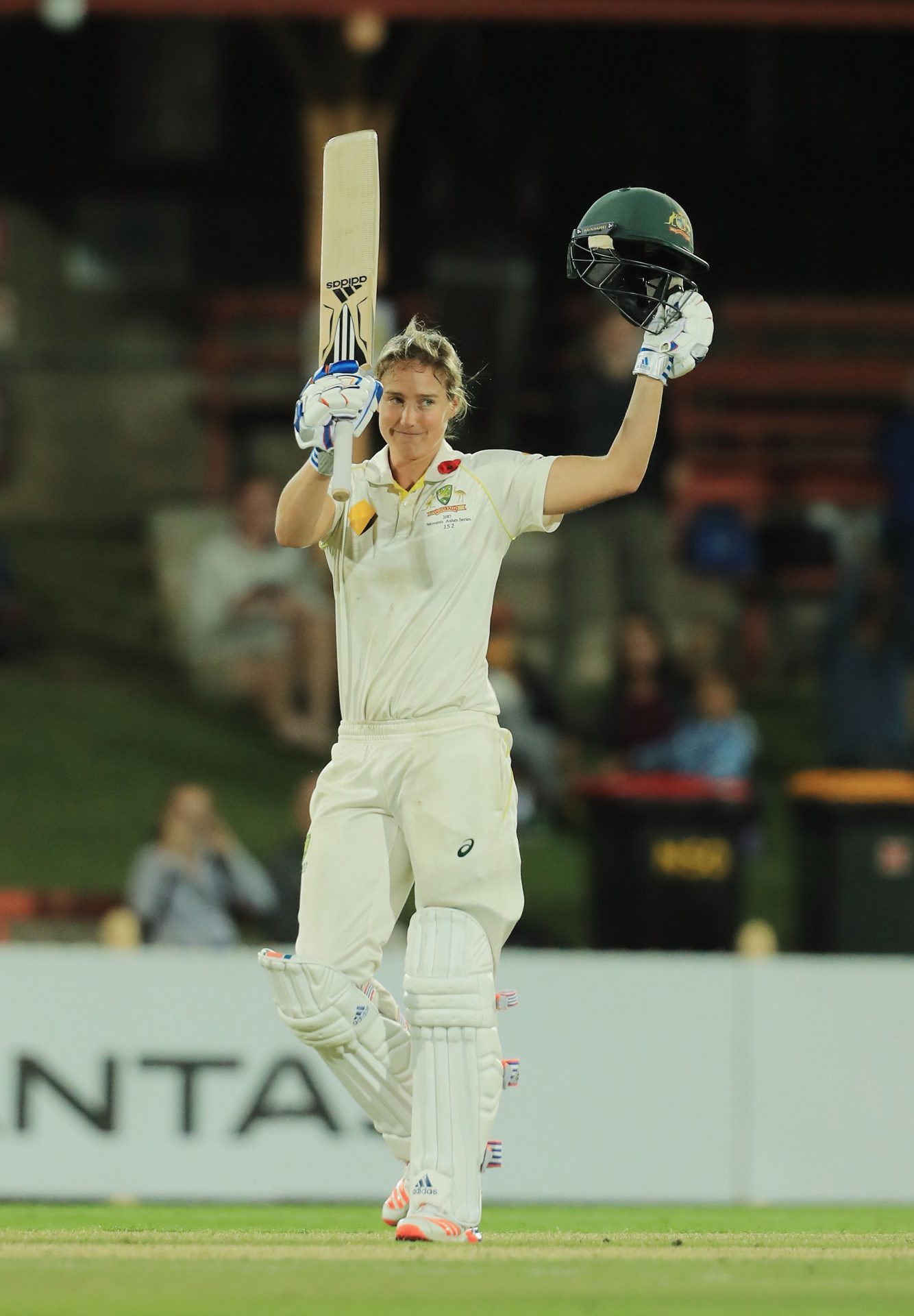 Ellyse Perry salutes the crowd after making her double century. A few balls before, she celebrated too early – her stroke going for four and not six.