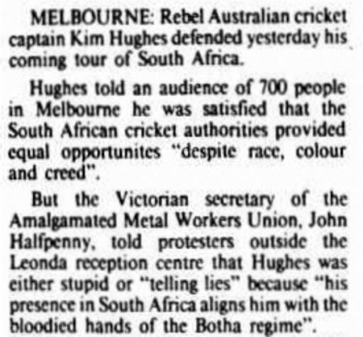 REBEL TOUR TO SOUTH AFRICA MIXES POLITICS WITH SPORTS