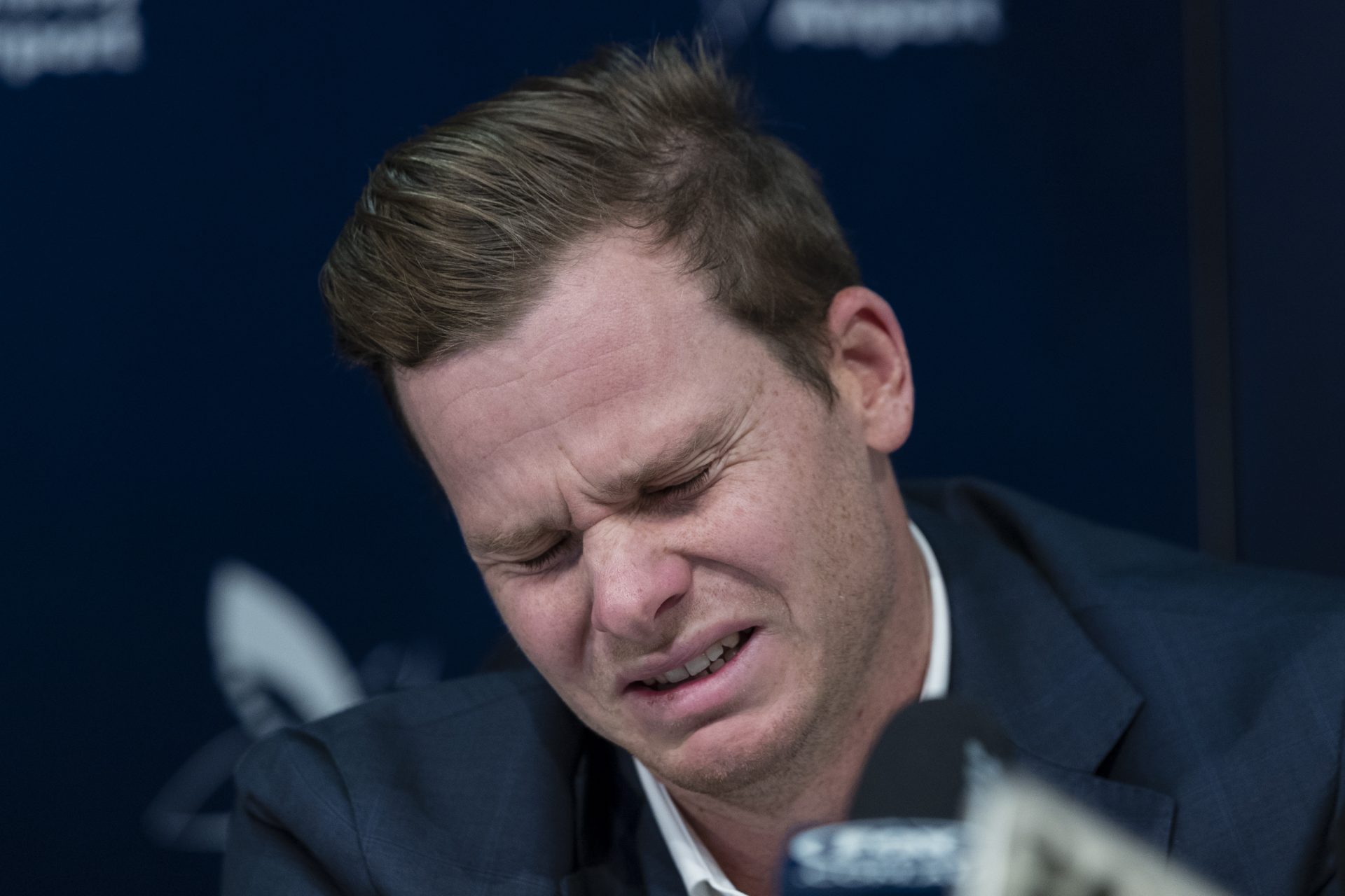 Steve Smith breaks down during a press conference after being flown back to Australia following the investigation into ball tampering.